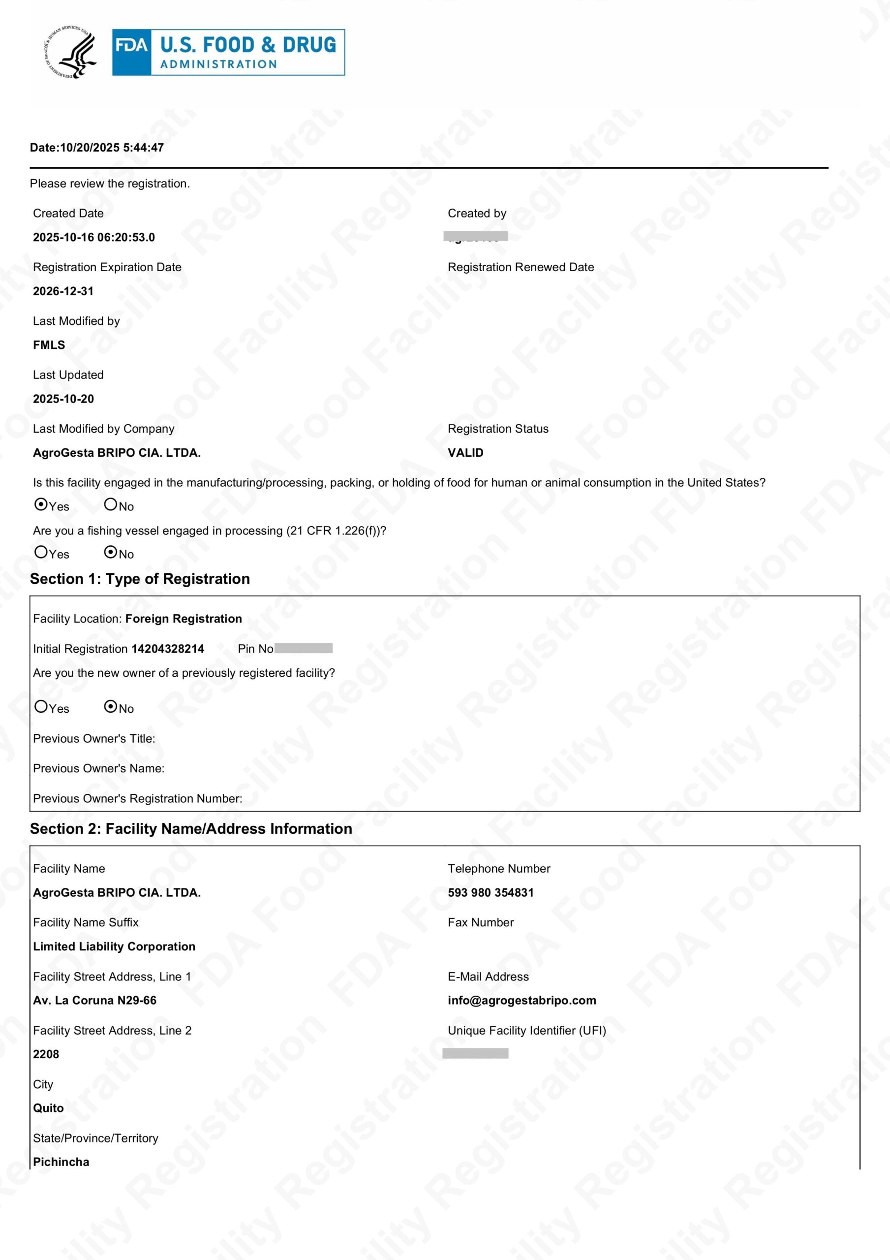FDA – Food Facility Registration (USA)